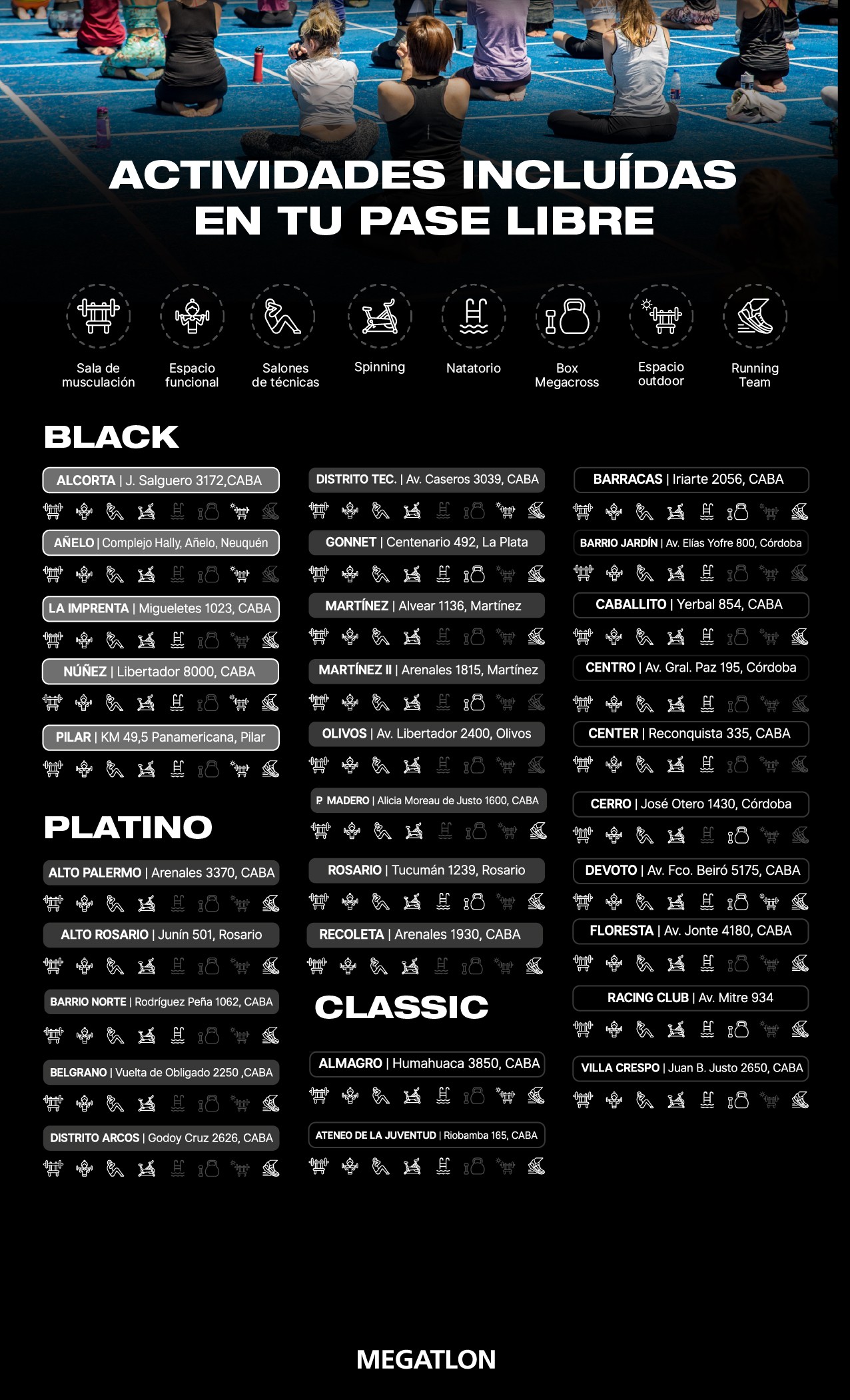 Ingreso irrestricto, acceso y uso de todas las instalaciones y actividades no aranceladas. Libre acceso a las clases de gimnasia aeróbica, así como a los salones de musculación y a la pileta de los centros que la posean.